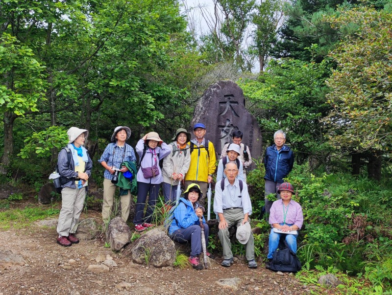 今夏の暑さで夏バテ気味だったり、台風の雨を心配してのキャンセルもあった中、12名が集まった。 9時頃はまだ小雨が降っていたが、予定していた「天の河原」へは雨が心配で行かないことなどのコース説明をしているうち雨が止み、出発。 頂上周辺は花盛りではないが、所々に趣のある花が咲く。 ミヤマウズラ、ミヤマモジズリは小さいながらラン科植物である。 用心のため持ち歩いた傘は開かずに済み、少し早めのお開きとした。 |