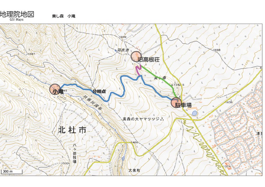 | コース | 美し森駐車場→美し森山頂→遊歩道→高根荘南分岐 →林道→小滝(昼食)→林道→美し森駐車場 |