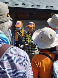 入笠ボランティア協会による開会の挨拶が終わると、「八ヶ岳自然クラブのみなさ〜ん」と呼ばれ、 「木道の下に足を下ろしてもいい」と言われても、ワレモコウやオミナエシ、ウメバチソウ、やマツムシソウ等がぎっしり生えていて、 標高1730mの入笠湿原は涼しいはずだが、それでも日なたでの作業は汗が滲む。頂いた麦茶を飲みながら約2時間の作業を行った。 昼食後は、当クラブの目的である観察会となって、黄・紫・白と、花々が美しい入笠湿原を時計回りに回ってゴンドラ駅方面に向かう。 山野草園の入り口ではレンゲショウマが見頃で、フシグロセンノウ、ヒヨドリバナ等も見事であった。 |