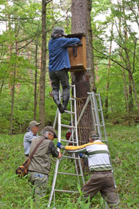 次の現場は巣箱の引っ越しです。抱卵していたフクロウが営巣を中止し抱卵を諦めた巣箱です。