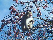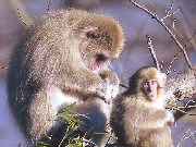 コメント:近年、南アルプス方面から八ケ岳南麓へと住民票を移しつつあります。今のところは、七里ケ岩沿い(釜無川)の森などに生息しており、農作物を荒らすようになり、有害獣として駆除されつつあります。写具上は柿食い猿、下の親子猿ともども小淵沢町で1月に撮影しました。 |