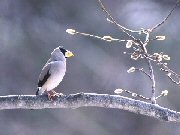 目立つ大きな黄色い嘴と淡いグレーの体色から、始めて見た人はその美しさから飼い鳥が逃げ出したのかと思うくらいのインパクトを与える鳥です。鳴き声も透き通った綺麗な大きな声ですから、聞き逃すことはないでしょう。八ヶ岳高原では、かっては漂鳥でしたが今では留鳥として一年中見ることが出来ます。地球温暖化の影響でしょうか。庭の餌台に数十羽の群れがやって来る所もあります。